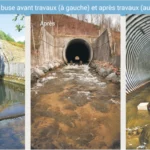 L’ouvrage hydraulique OH 448 de l’A89 est constitué d’une buse métallique de type ARMCO en tôle ondulée longue de 104 mètres avec une pente de 1 % (photo 1). Jusqu’en 2016, avant les travaux d’aménagement, cet ouvrage était totalement infranchissable à la montaison pour la truite commune, espèce cible sur la Durolle. En effet, les conditions d’écoulement à l’intérieur de l’ouvrage étaient incompatibles avec les exigences de l’espèce pour les raisons suivantes :