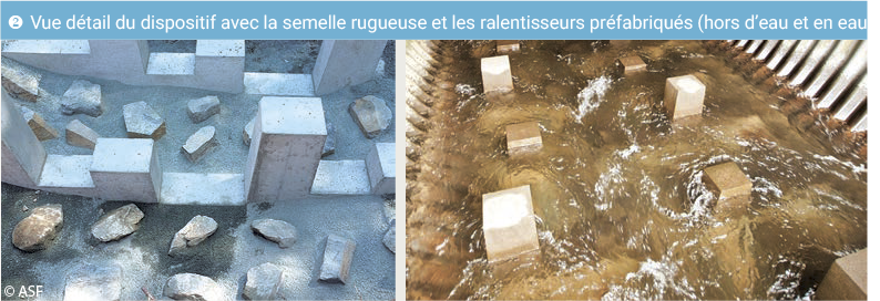 En 2016, un dispositif hydraulique unique constitué d’une semelle rugueuse et de ralentisseurs préfabriqués a été aménagé à l’intérieur de la buse pour respecter au mieux les exigences de la truite commune en termes de hauteurs d’eau, de vitesses de courant, et d’abris hydrauliques (photo 2). Le dispositif a été théoriquement conçu pour assurer des conditions hydrauliques favorables au franchissement de la truite pour des débits compris entre le QMNA5 2 et 2,5 fois le module 3, soit de 0,18 à 2,5 m3/s, avec une plage préférentielle de fonctionnement entre 0,78 et 1,19 m3/s.