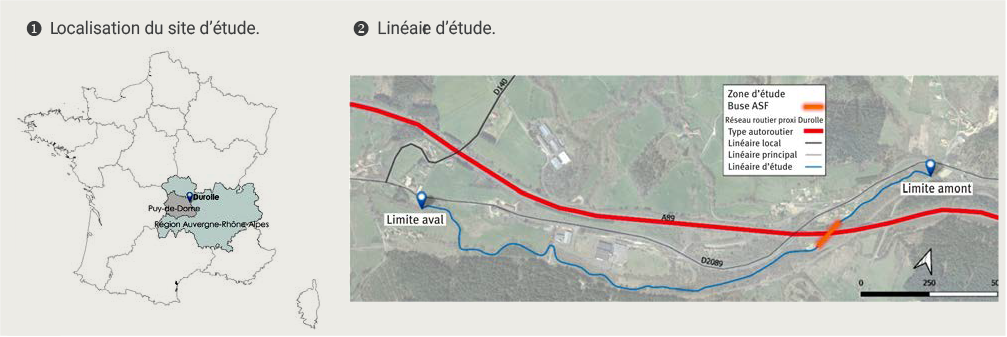 La Durolle est une rivière salmonicole du Massif central située dans le Puy-de-Dôme (figure 1), qui abrite une population de truites naturellement fonctionnelle et abondante. Sur la commune de Saint-Rémy-sur-Durolle, la rivière a été busée sur 104 mètres en 1978 lors de la construction de l’A72, devenue ensuite l’A89 (figure 2). Cet ouvrage représentait un obstacle infranchissable pour les truites en raison des conditions d’écoulement à l’intérieur de la buse : vitesses de courant trop élevées et homogènes, absence de zones de repos (abris hydrauliques).