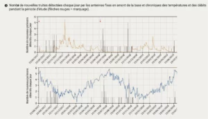 Sur les 730 jours du suivi, les antennes ont correctement fonctionné la grande majorité du temps : l’antenne 1 a fonctionné 99,2 % du temps et l’antenne 2, 97,4 % du temps.