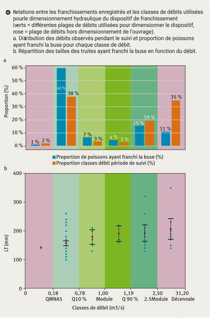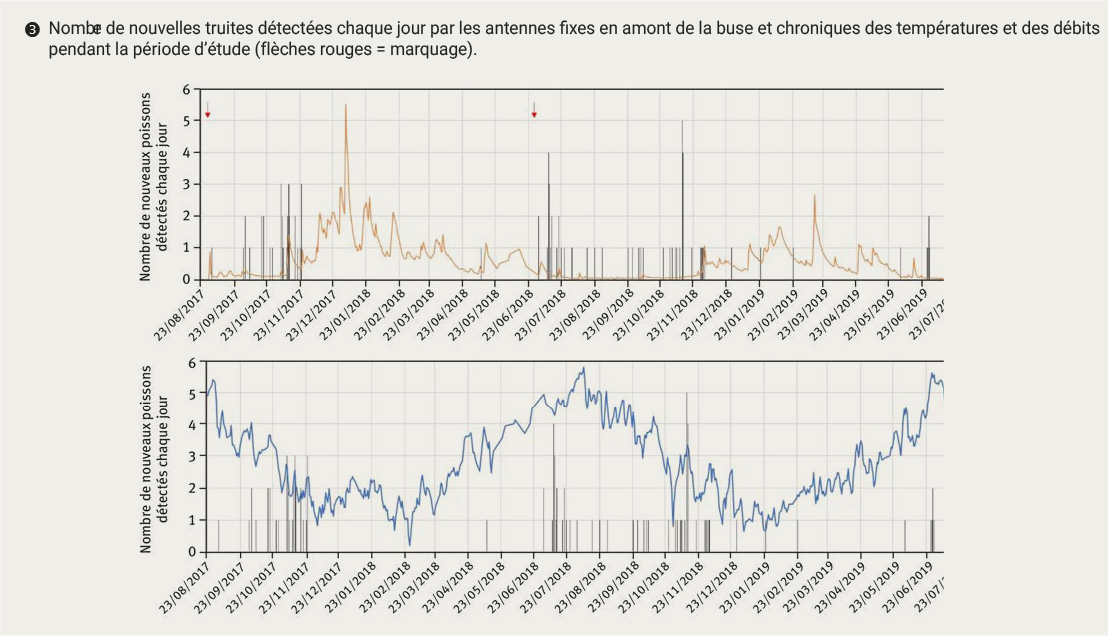 L’efficacité de détection du dispositif a été estimée à 99,9 % d’après la formule de Zydlewski et al. (2006), ce qui signifie que la probabilité qu’un poisson marqué ne soit pas détecté par le dispositif est quasi nulle. Les données collectées peuvent donc être considérées exhaustives et garantissent une analyse valable du franchissement de la buse par les truites.