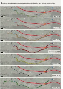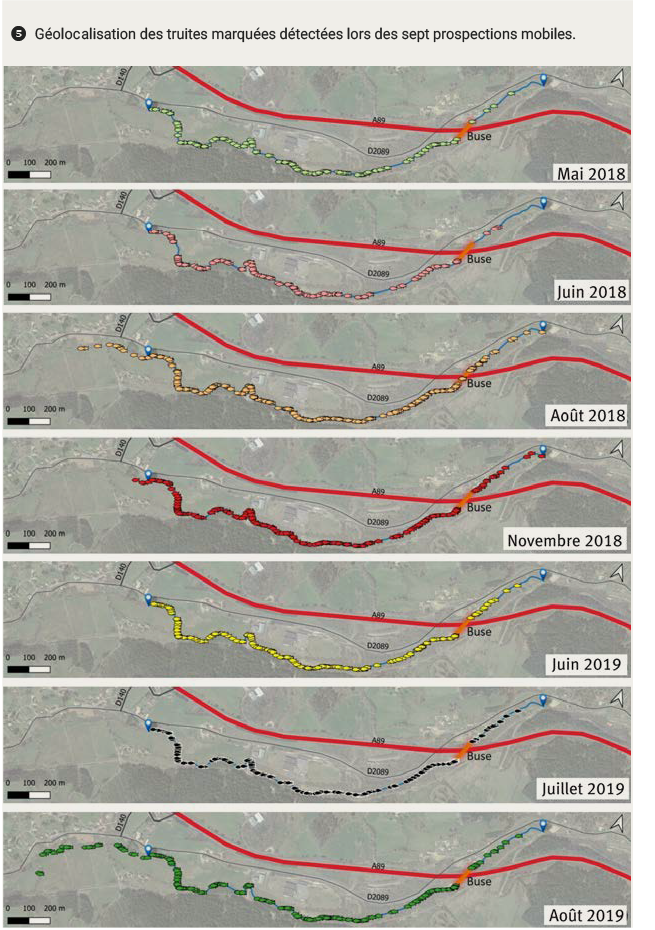 Finalement, sur la totalité des 815 truites marquées présentes en aval de la buse, si l’on retire les 165 individus qui ont franchi la buse, 450 individus ont été détectés au moins une fois par prospection mobile et 200 n’ont jamais été redétectés.
